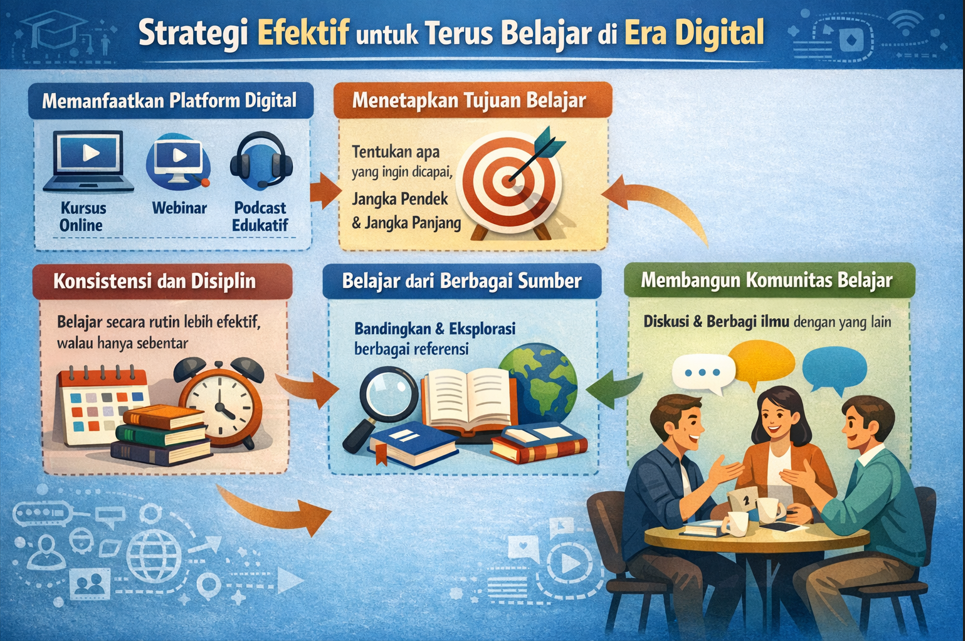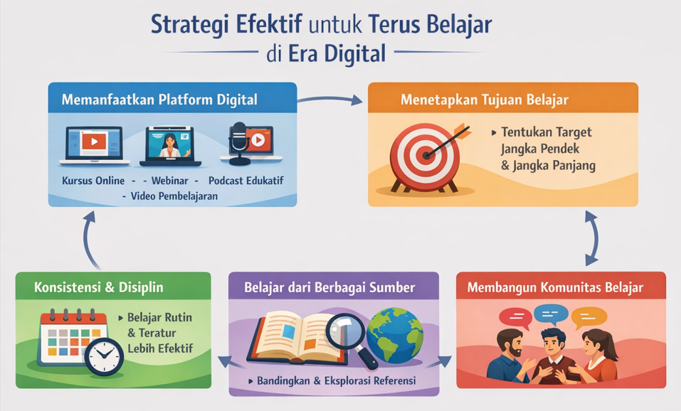 Terus belajar di era digital bukan sekadar tuntutan, tetapi merupakan kunci utama untuk bertahan dan berkembang. Individu yang mampu beradaptasi dan terus meningkatkan kompetensinya akan lebih siap menghadapi tantangan masa depan.